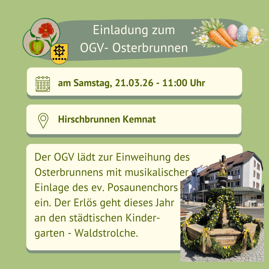 Am Samstag, 5. April wird der Osterbrunnen am Hirschbrunnen mit dem evangelischen Posaunenchor eingeweiht. Bei geselligem Beisammensein mit selbstgebackenem Handgebäck